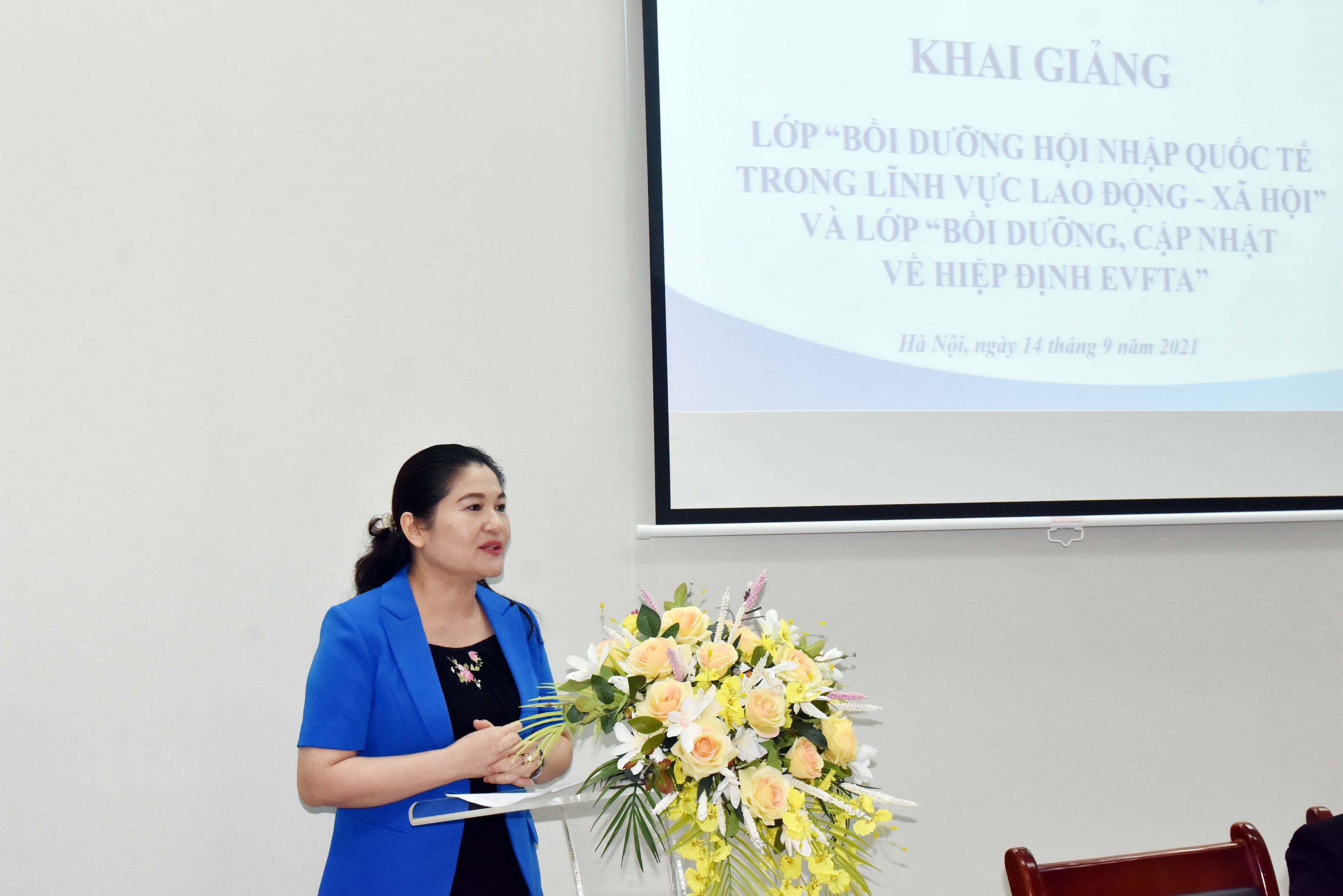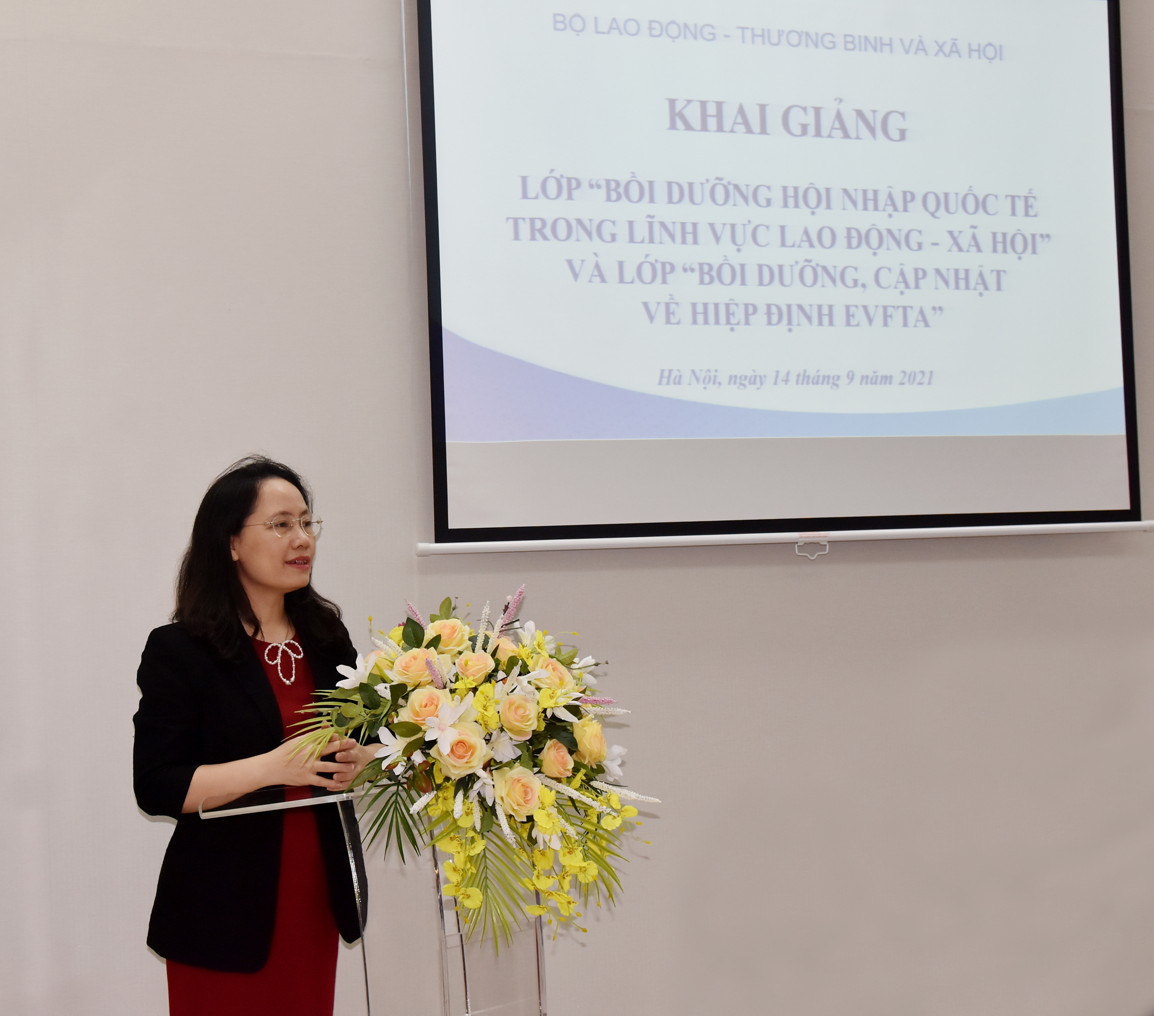 Phát biểu tại Lễ khai giảng, Thứ trưởng Nguyễn Thị Hà nhấn mạnh: Hội nhập quốc tế là chủ trương lớn, nhất quán, xuyên suốt của Đảng và Nhà nước ta. Với vai trò là cơ quan đầu mối tổng hợp, tham mưu trình Thủ tướng và Chính phủ các kế hoạch, đề án và chiến lược tổng thể liên quan đến công tác Hội nhập quốc tế trong lĩnh vực lao động và xã hội, Bộ LĐ-TB&XH đã tham mưu Thủ tướng Chính phủ ban hành và triển khai thực hiện Chiến lược hội nhập quốc tế về lao động và xã hội đến năm 2020, tầm nhìn đến năm 2030. Giai đoạn 2016 – 2020, công tác hội nhập quốc tế về lao động và xã hội đã tham gia vào sân chơi chung toàn cầu, hoàn thiện thể chế trên cơ sở tiếp cận các tiêu chuẩn và thông lệ quốc tế về lao động và xã hội; thực hiện lồng ghép, nội luật hóa các cam kết quốc tế, các tiêu chuẩn ASEAN và quốc tế trong xây dựng thể chế, hoàn thiện hệ thống quản lý và hệ thống dịch vụ chuyên ngành. Hội nhập quốc tế trong lĩnh vực lao động, xã hội cũng được đẩy mạnh qua các kênh hợp tác đa phương, khu vực như Hội đồng quản trị của Tổ chức lao động quốc tế ILO, Cộng đồng Văn hóa – Xã hội ASEAN, các đối tác song phương truyền thống như Lào, Nga… các đối tác tiềm năng như Nhật bản, Hàn Quốc, Đức, EU, Hoa Kỳ…và với các tổ chức phi chính phủ nước ngoài như SOS, CNCF… thu hút thêm được nguồn lực từ bên ngoài, góp phần quan trọng giải quyết các vấn đề lao động và xã hội của Việt Nam như phát triển thị trường lao động, quan hệ lao động, phát triển nguồn nhân lực và việc làm; quản lý lao động di cư; phát triển hệ thống an sinh xã hội; giảm nghèo bền vững; trợ giúp xã hội nhóm yếu thế và dễ bị tổn thương; bảo vệ, chăm sóc trẻ em có hoàn cảnh khó khăn; công tác bình đẳng giới…