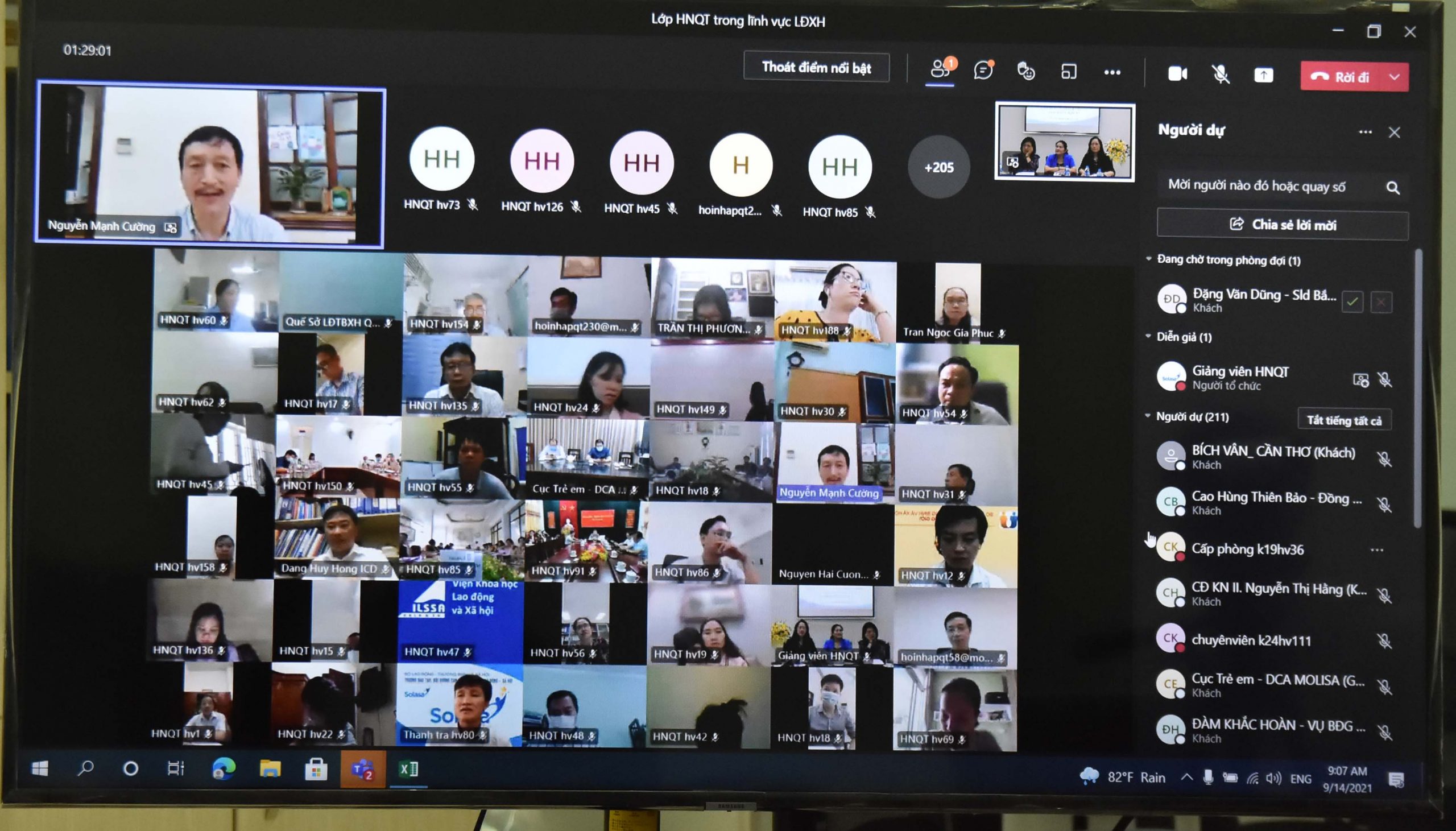 Đại diện lãnh đạo, chuyên viên các đơn vị thuộc Bộ và hơn 30 Sở LĐTBXH các tỉnh, thành phố tham dự.Bà Trần Thị Thu Hằng, Phó Vụ trưởng, Vụ Tổ chức cán bộ công bố các quyết định mở lớpÔng Nguyễn Thanh Hải, Vụ trưởng Vụ Chính sách đối ngoại, Bộ Ngoại giao trình bày chuyên đề: “Cập nhật tình hình thế giới, khu vực; Đường lối đối ngoại của Việt Nam và những vấn đề đặt ra với Hội nhập quốc tế của đất nước trong đại dịch Covid-19”.