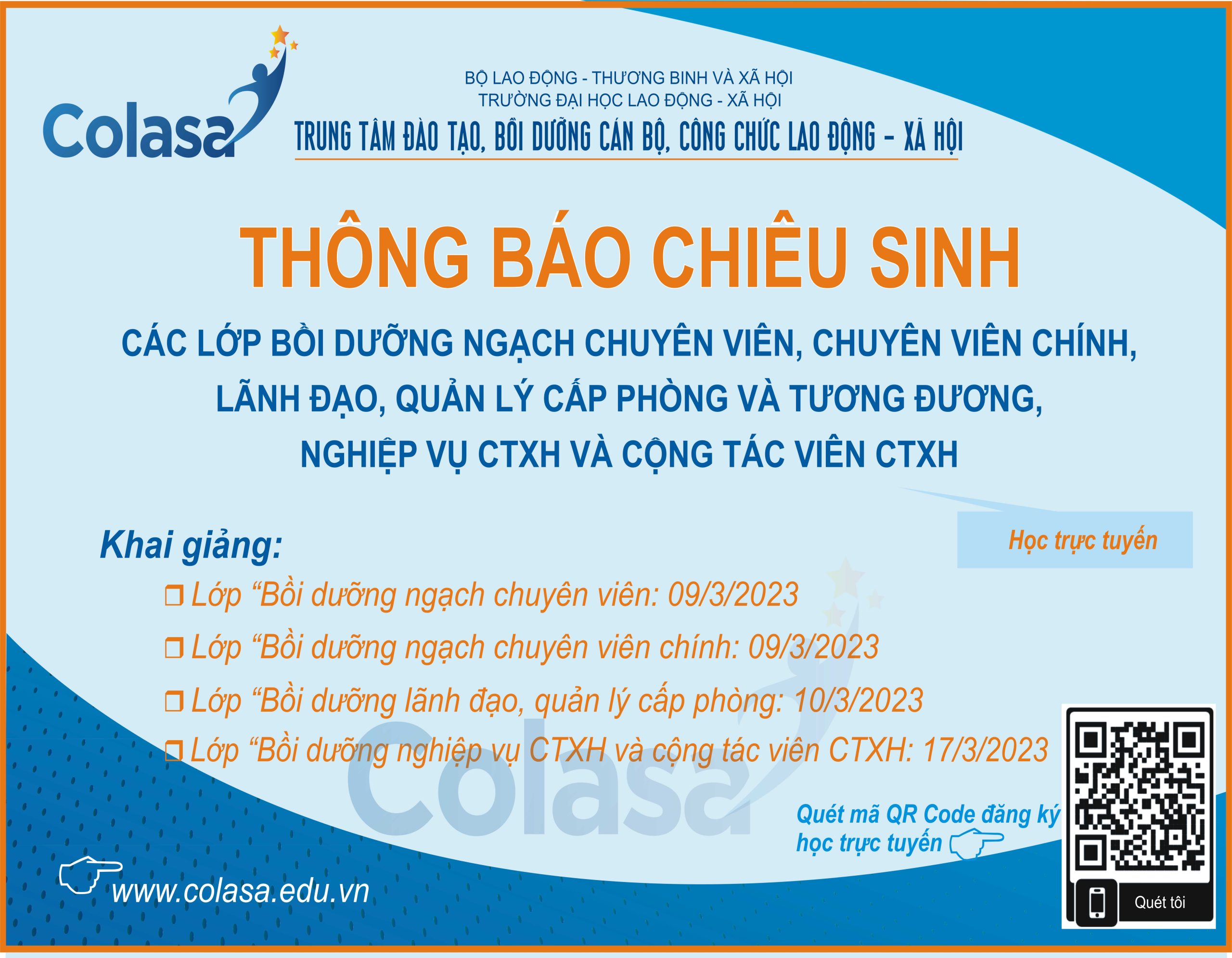 Trung tâm Đào tạo, bồi dưỡng cán bộ, công chức lao động – xã hội, Trường Đại học Lao động – Xã hội tổ chức chiêu sinh các lớp bồi dưỡng ngạch chuyên viên, ngạch chuyên viên chính và tương đương; bồi dưỡng lãnh đạo, quản lý cấp phòng và tương đương, nghiệp vụ CTXH và cộng tác viên CTXH theo hình thức học từ xa (trực tuyến), cụ thể như sau:
