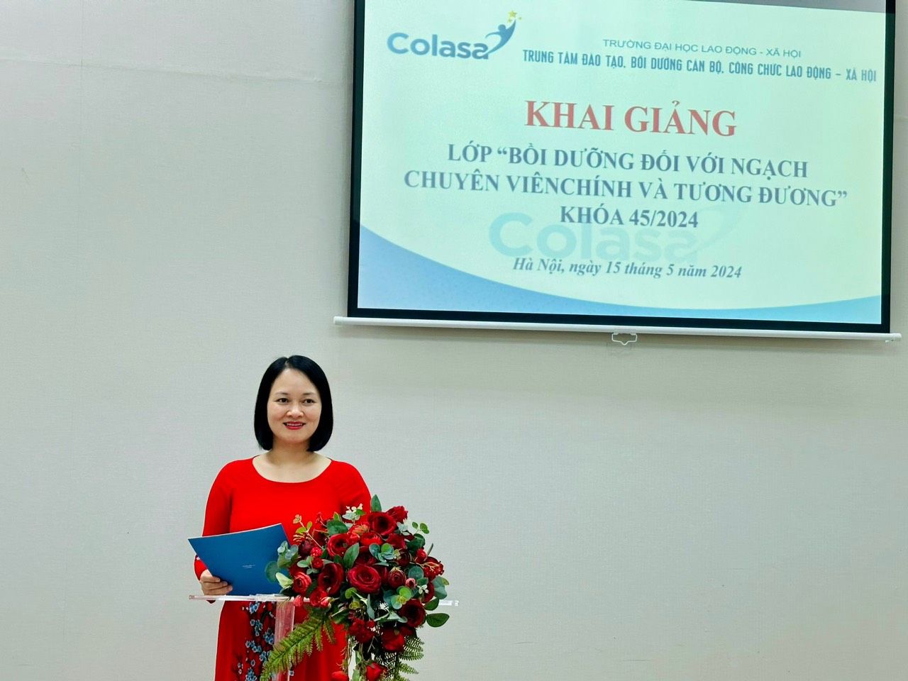 Bà Trần Mai Phương, Phó Giám đốc Trung Đào tạo, bồi dưỡng cán bộ, công chức lao động – xã hội phát biểu khai giảng lớp học
