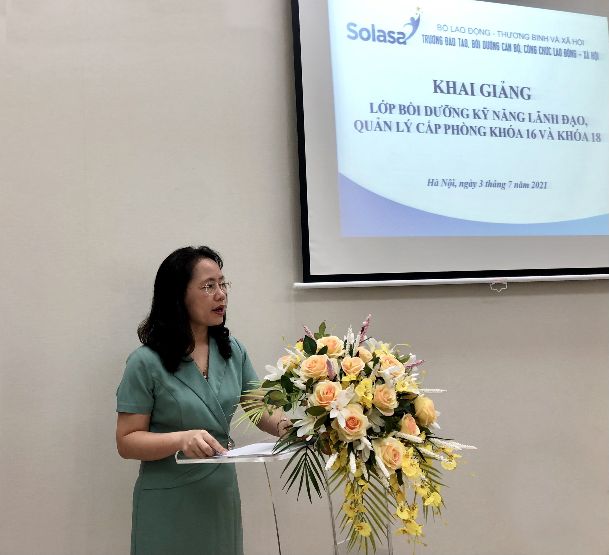 Phát biểu tại buổi lễ khai giảng, bà Vũ Ngọc Thủy, Hiệu trưởng Nhà trường đã nêu bật ý nghĩa và tầm quan trọng của việc bồi dưỡng kỹ năng lãnh đạo, quản lý cấp phòng cũng như nhấn mạnh phương châm đào tạo, bồi dưỡng “thực học – thực nghiệp” hướng đến những thay đổi về chất lượng đào tạo hiện nay. Tại bài phát biểu, bà Vũ Ngọc Thủy mong muốn các Giảng viên nhiệt tình chia sẻ, trao đổi kiến thức, kinh nghiệm qua phương pháp giảng dạy tích cực, hiện đại, giúp cho các học viên tiếp thu được tốt nhất những nội dung kiến thức, kỹ năng chuyên môn của khóa học cũng như có khả năng ứng dụng và truyền đạt cao nhất các kiến thức, kỹ năng này. Bà Vũ Ngọc Thủy cũng kỳ vọng tất cả Học viên của Khóa học nêu cao tinh thần trách nhiệm, nghiêm túc chấp hành, nội quy, chương trình khóa học, lắng nghe và tích cực tham gia vào các phần thảo luận, hỏi đáp để tìm hiểu sâu hơn và rõ hơn các nội dung giảng viên truyền đạt cũng như chia sẻ, học hỏi kinh nghiệm từ thực tiễn, từ các học viên khác đề làm giàu thêm kiến thức, kỹ năng của mình.