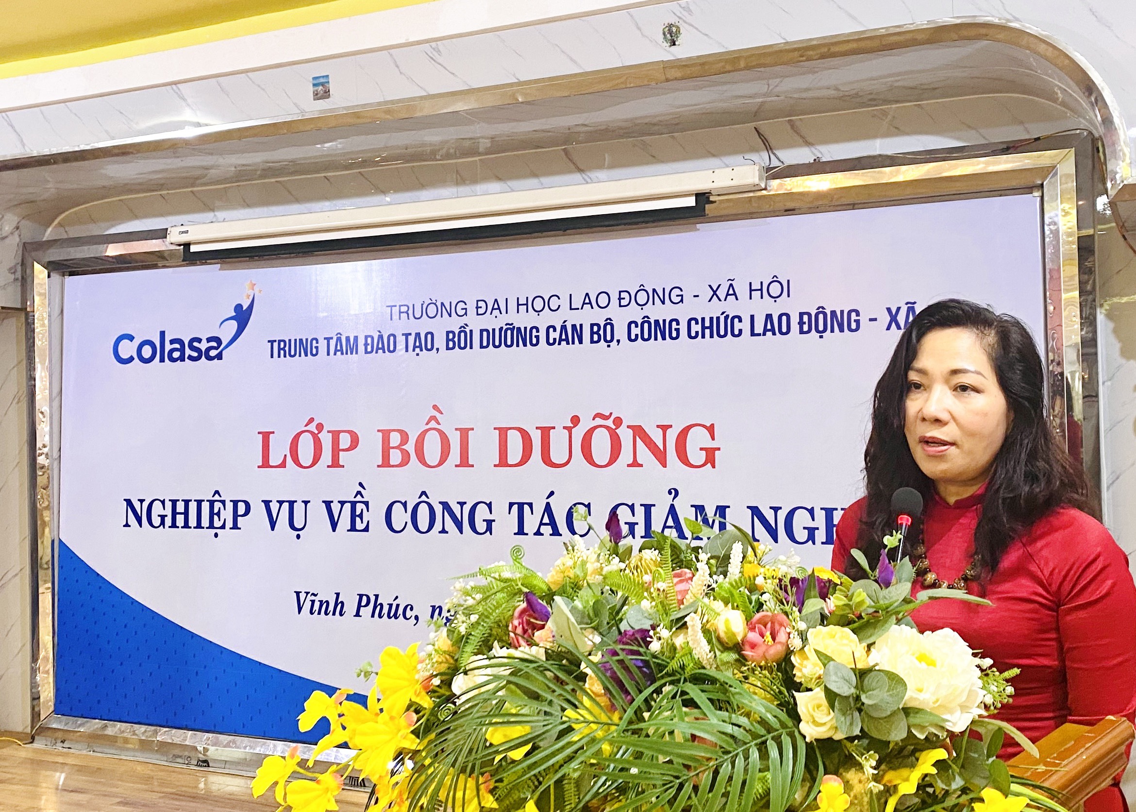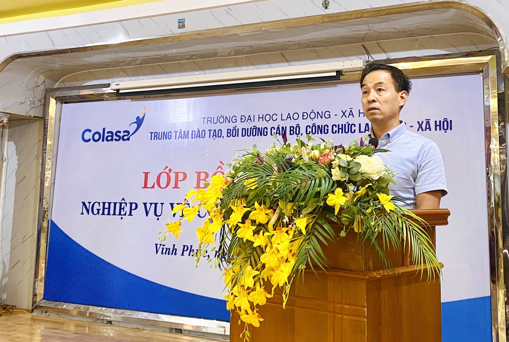 Đến dự và phát biểu khai mạc lớp có TS. Nguyễn Thị Vân, CVCC, Phó Hiệu trưởng Trường Đại học Lao động – Xã hội, Giám đốc Trung tâm Đào tạo, bồi dưỡng cán bộ, công chức lao động – xã hội và Ông Vũ Anh Nam, Trưởng phòng Bảo trợ xã hội và Trẻ em, Sở Lao động – Thương binh và Xã hội tỉnh Vĩnh Phúc.