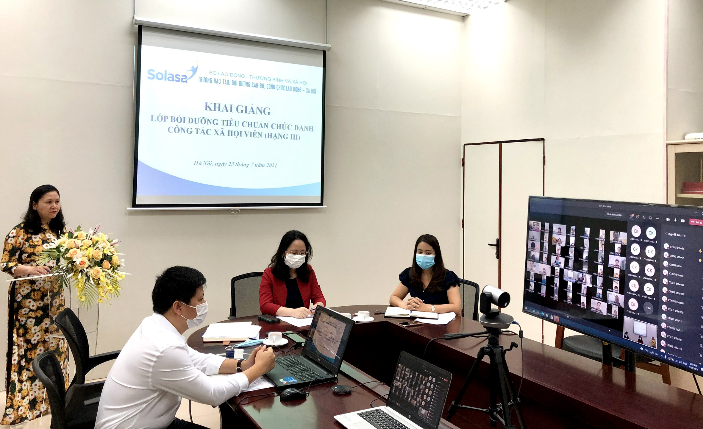 Trong bối cảnh dịch Covid 19 vẫn còn đang phức tạp, để đảm bảo công tác đào tạo bồi dưỡng được triển khai bình thường, các học viên vẫn đảm bảo việc nâng cao năng lực trong trạng thái “bình thường mới”. Trường Đào tạo, bồi dưỡng cán bộ công chức lao động xã hội đã quyết định tổ chức Khóa học theo hình thức bồi dưỡng trực tuyến trên phần mềm MS TEAMS cho toàn bộ chương trình với 17 chuyên đề. Nội dung chương trình bồi dưỡng: Theo Quyết định số 1751/QĐ-LĐTB&XH về việc ban hành các chương trình bồi dưỡng theo tiêu chuẩn chức danh nghề nghiệp viên chức chuyên ngành công tác xã hội (hạng III, hạng IV) và cộng tác viên công tác xã hội tập trung vào các nội dung sau: Một số vấn đề chung về quản lý hành chính nhà nước; Định hướng phát triển nghề công tác xã hội ở Việt Nam; Viên chức và Văn hóa công sở; Tiêu chuẩn chức danh và đạo đức nghề nghiệp công tác xã hội viên; Kỹ năng giao tiếp; Kỹ năng làm việc nhóm; Kỹ năng thu thập và xử lý thông tin; Giới thiệu nghề công tác xã hội; Hành vi con người và môi trường xã hội; Công tác xã hội với cá nhân và gia đình; Công tác xã hội với nhóm; Công tác xã hội với tổ chức và cộng đồng; Chính sách trợ giúp xã hội; Phương pháp nghiên cưu trong công tác xã hội; Quản lý trường hợp; Công tác xã hội với người có nhu cầu đặc biệt; Quản trị trong công tác xã hội.