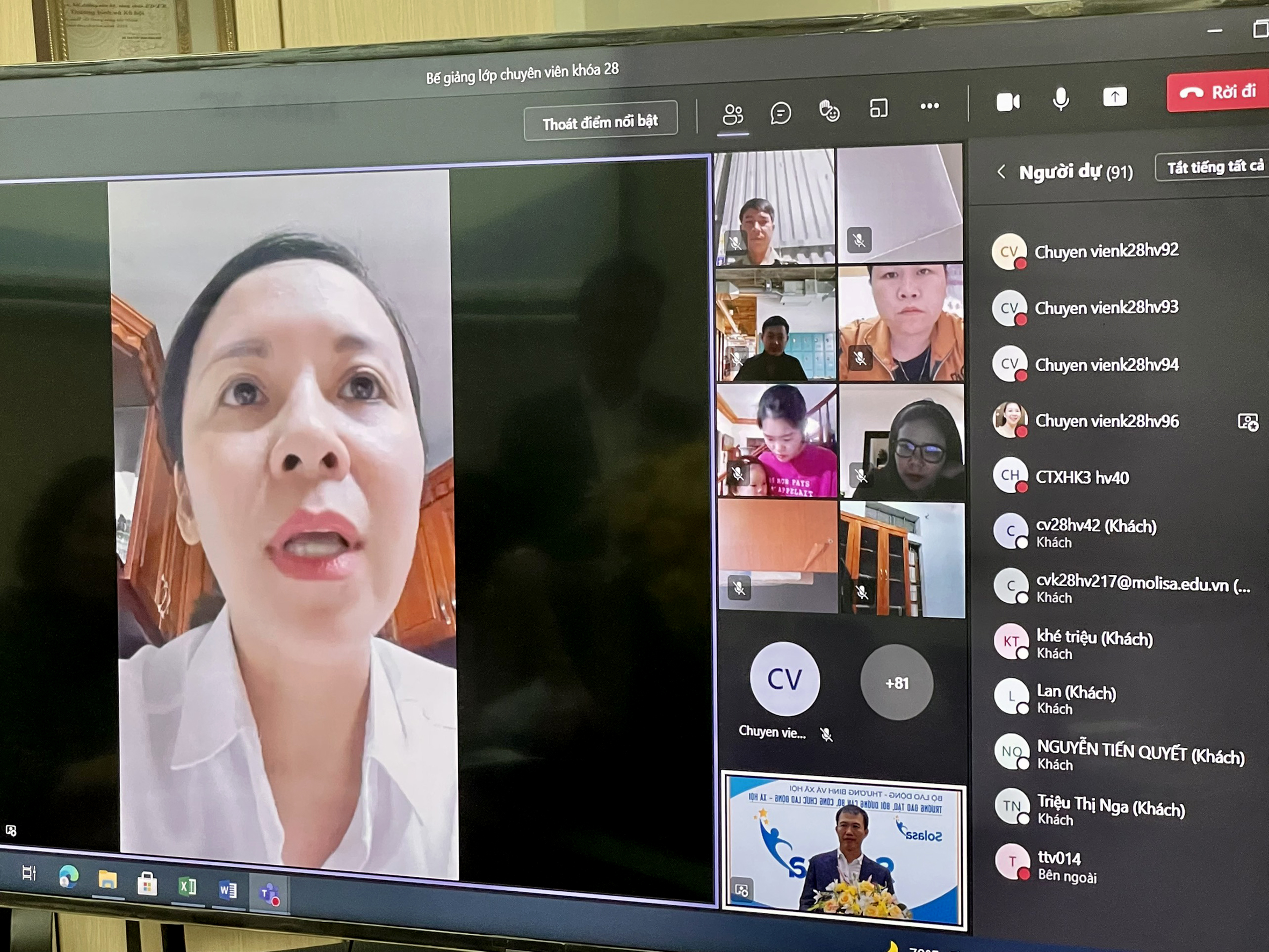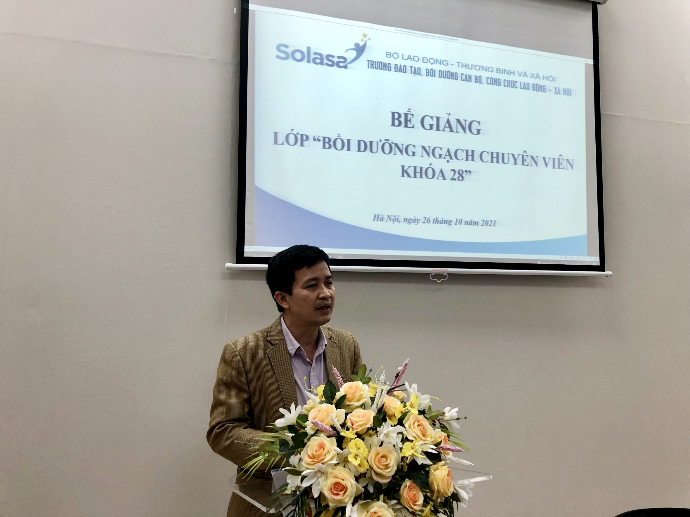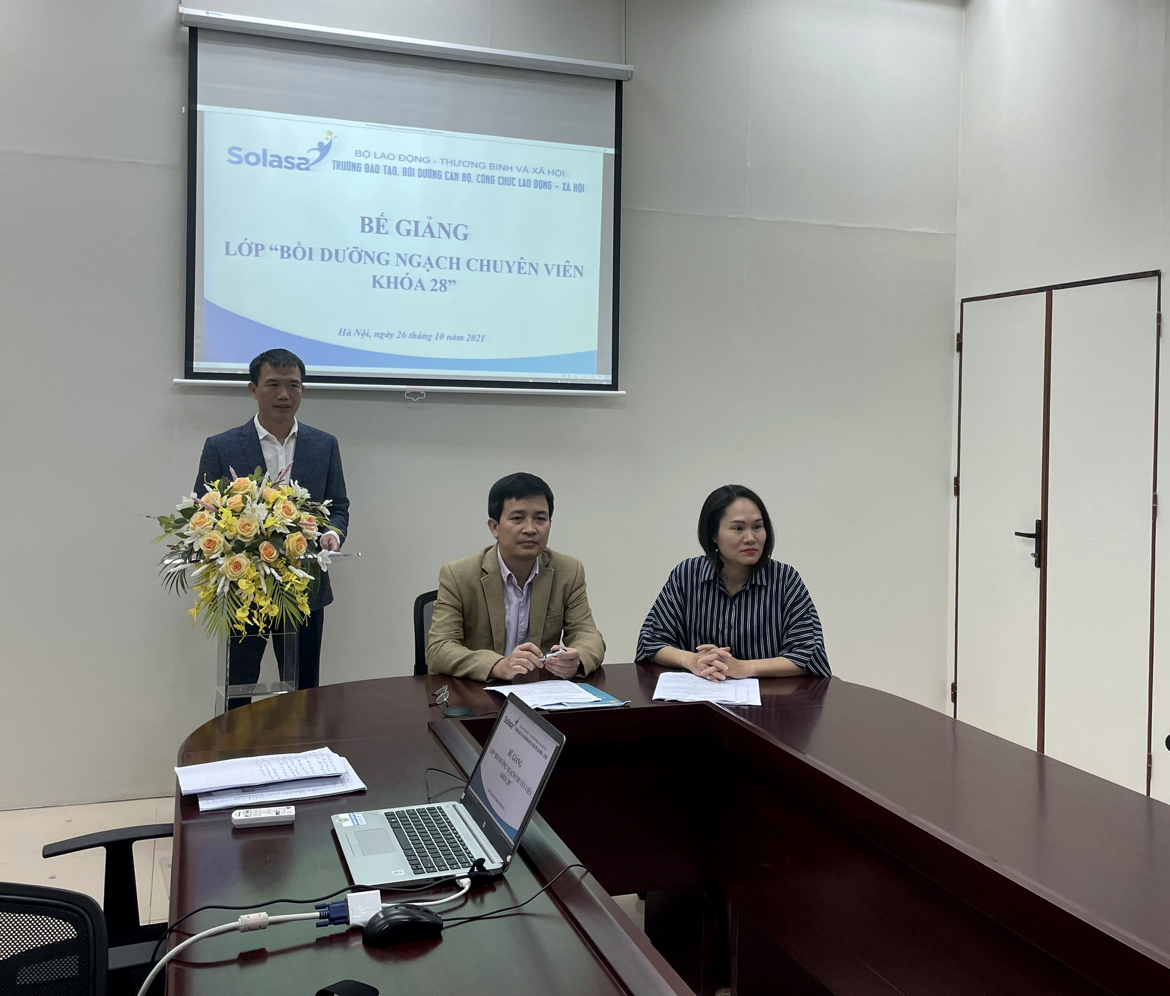 Tham dự buổi bế giảng có Ông Lê Đức Quang – Phó Hiệu trưởng Trường Đào tạo, bồi dưỡng cán bộ, công chức lao động – xã hội cùng các học viên lớp bồi dưỡng ngạch Chuyên viên khóa 28. Lớp bồi dưỡng ngạch Chuyên viên khóa 28 diễn ra từ ngày 08/7/2021 đến ngày 26/10/2021. Trong hơn ba tháng học tập, các học viên đã được trang bị kiến thức cơ bản về quản lý nhà nước chương trình chuyên viên với ba cụm chuyên đề gồm có: Kiến thức chung về hành chính nhà nước; Quản lý nhà nước theo ngành và lãnh thổ; Những kỹ năng cơ bản. Các học viên đã làm hai bài kiểm tra và một bài tiểu luận tình huống trong quản lý hành chính nhà nước, đây là căn cứ để Trường Đào tạo, bồi dưỡng cán bộ, công chức lao động – xã hội cấp chứng chỉ cho các học viên hoàn thành khóa học.