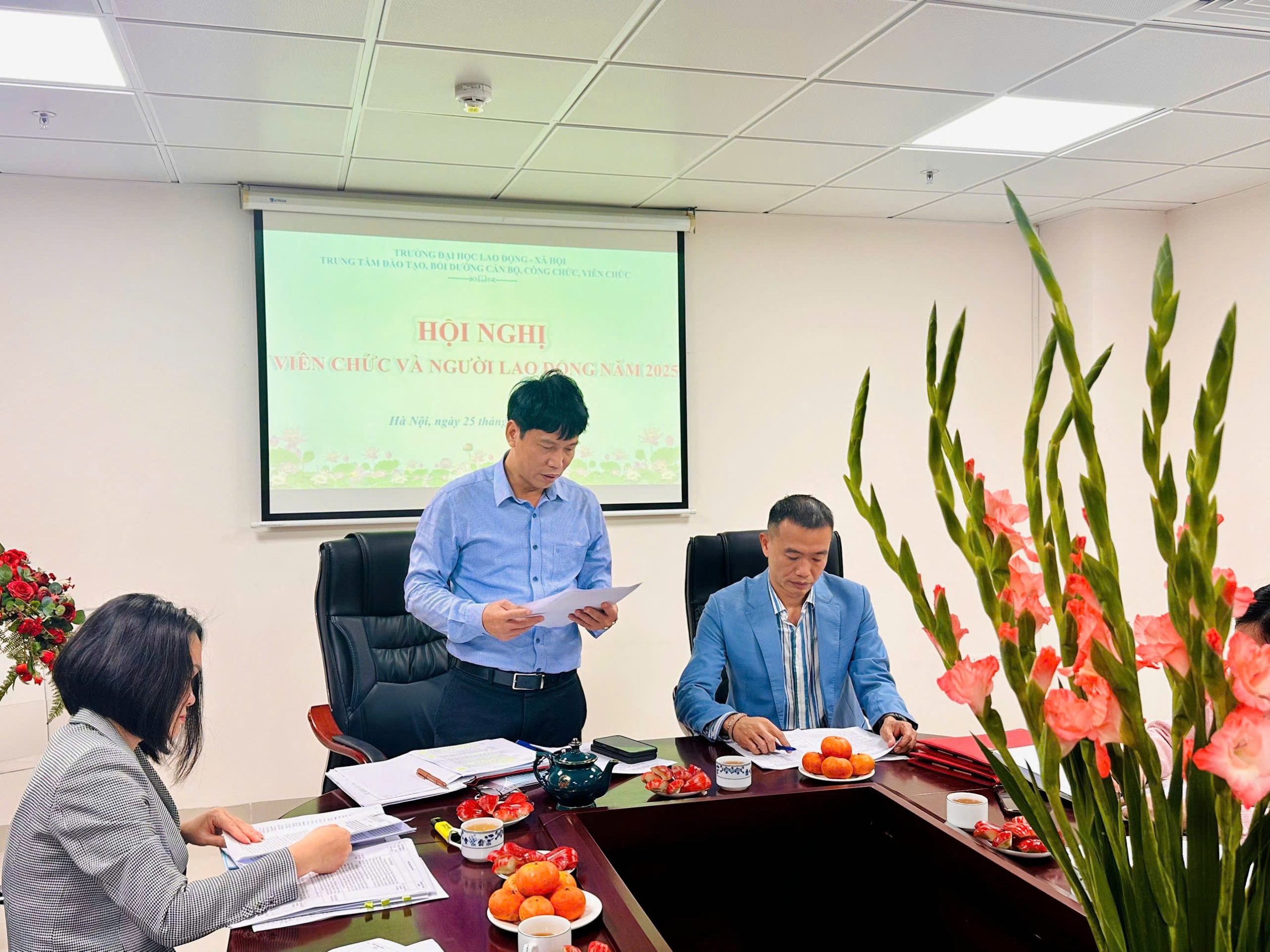 Phát biểu bế mạc Hội nghị, đồng chí Nguyễn Mạnh Cường, Phó Hiệu trưởng Trường Đại học Lao động – Xã hội, Bí thư chi bộ, Giám đốc Trung tâm đã ghi nhận, biểu dương và đánh giá cao tinh thần trách nhiệm, sự đoàn kết, nỗ lực và những đóng góp tích cực của toàn thể viên chức, người lao động trong việc thực hiện các nhiệm vụ chính trị và chuyên môn của Trung tâm trong năm 2025. Đồng chí nhấn mạnh, những kết quả đạt được là minh chứng rõ nét cho sự đồng lòng, quyết tâm và tinh thần đổi mới, sáng tạo của tập thể Trung tâm trong bối cảnh còn nhiều khó khăn, thách thức. Đồng thời, đồng chí đề nghị các phòng chuyên môn, các tổ chức đoàn thể và mỗi viên chức, người lao động tiếp tục phát huy tinh thần trách nhiệm, chủ động, sáng tạo; khẩn trương cụ thể hóa các nội dung của Nghị quyết Hội nghị viên chức, người lao động năm 2025 thành các chương trình, kế hoạch hành động cụ thể, sát thực tiễn, bảo đảm tính khả thi và hiệu quả trong quá trình tổ chức thực hiện. Qua đó, góp phần nâng cao chất lượng công tác đào tạo, bồi dưỡng, xây dựng Trung tâm ngày càng ổn định, phát triển bền vững và hoàn thành tốt các nhiệm vụ được giao trong năm 2026 và những năm tiếp theo.