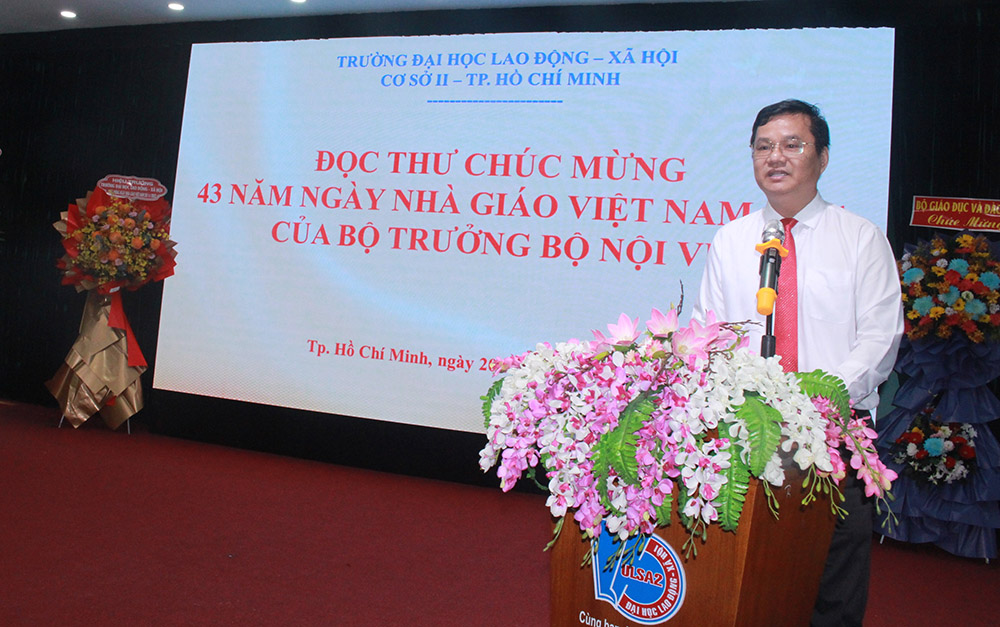 TS. Nguyễn Mạnh Cường, gửi lời thăm hỏi và bày tỏ sự tri ân tới các nhà giáo lão thành, các thầy cô và toàn thể cán bộ, viên chức, người lao động, những người đã và đang cống hiến cho Nhà trường. Đồng thời, biểu dương những nỗ lực không ngừng nghỉ của tập thể sư phạm của Trường Đại học Lao động – Xã hội (Cơ sở II) trong những năm qua.