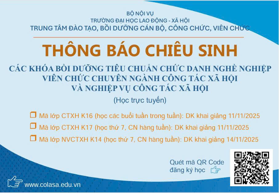 Trung tâm Đào tạo, bồi dưỡng cán bộ, công chức, viên chức, Trường Đại học Lao động – Xã hội tổ chức chiêu sinh các lớp bồi dưỡng tiêu chuẩn chức danh nghề nghiệp viên chức chuyên ngành công tác xã hội và bồi dưỡng nghiệp vụ công tác xã hội theo hình thức học trực tuyến, cụ thể như sau: